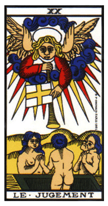Este arcano simboliza el renacer, es el concepto de la resurrección, el espíritu q vuelve a la materia, el final de un tiempo de sufrimiento y es hora de hacer balance de lo bueno y de lo malo de dicha etapa. Esta carta indica el despertar algo pasado , nuevas sensaciones, algo sorprendente inesperado, descubre una realidad .