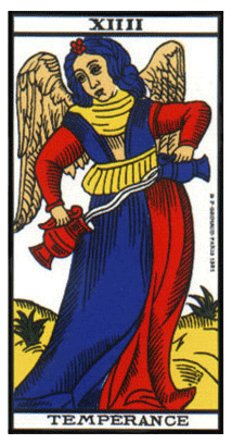 La Templanza simboliza la transformación en su forma mas refinada. Se produce aquí la unión de los opuestos. Del fuego y el agua, la luz y la oscuridad, lo masculino y lo femenino, la muerte y el renacimiento. Esta unión es el proceso creativo que se inicia en nuestro para acabar proyectándose al mundo exterior. Nos muestra necesidad de ajustes, de equilibrio y mesura en nuestra vida.